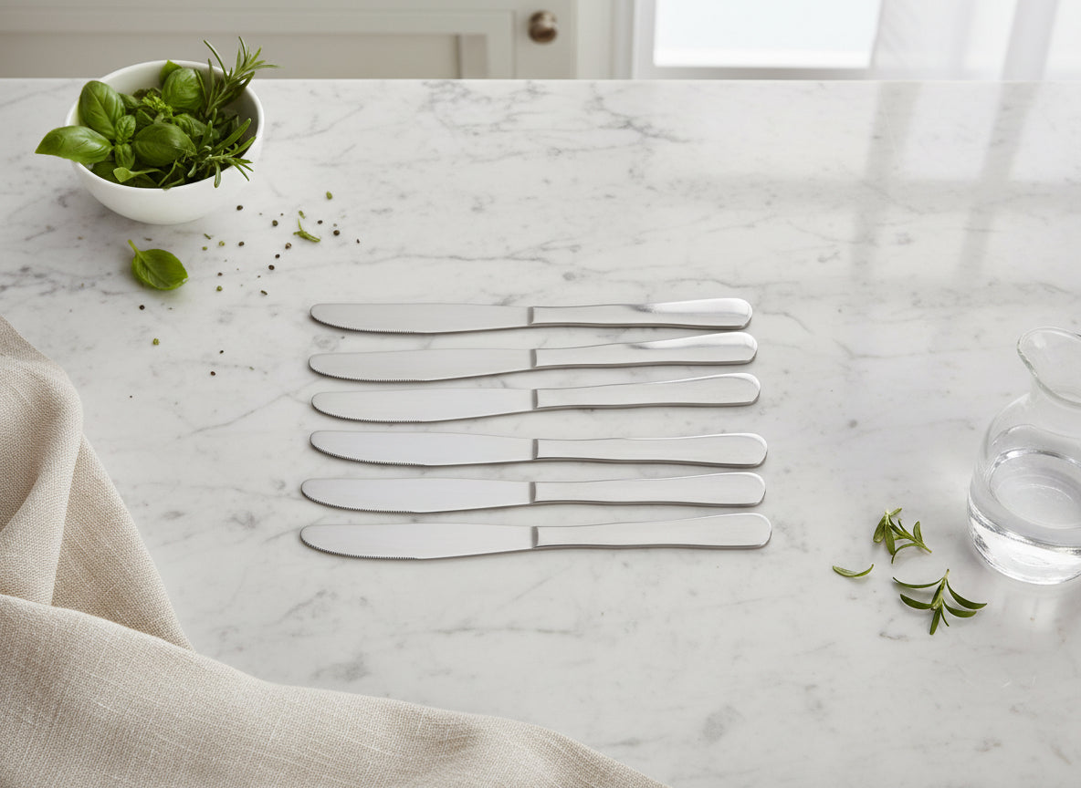 Elevate your table service with this professional-grade stainless steel butter knife set. Each of the six pieces features a polished finish and ergonomic design, ensuring smooth spreading and lasting durability. The corrosion-resistant stainless steel construction withstands daily use and frequent washing, making these knives ideal for both everyday dining and formal occasions. Perfect for families, restaurants, or catering services seeking reliable flatware that combines functionality with refined aesthetics.
