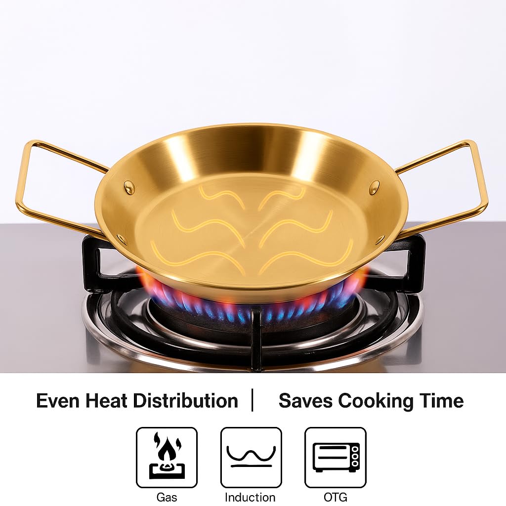 Stainless Steel Golden Serving Tray Round Spanish Seafood Cooking Pan with Two Handles Wok - KOREAN